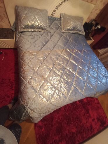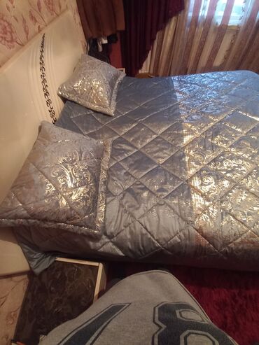 Şık yataq dəsti – atlas parça və zərif tüllə bəzədilmiş örtük və yastıq üzləri - Rəng: krem-şampan tonları, qızılı naxış və haşiyələr - Dizayn: iri çiçək aplikasiyaları, ətrafı incə bəzək tikişlər...