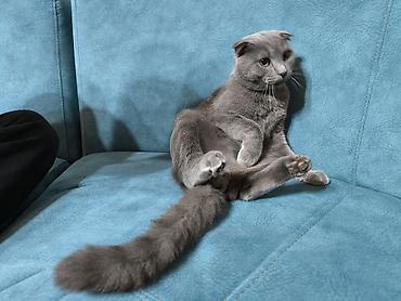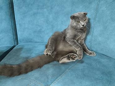 Britan pişiyi – Scottish Fold (qulaqcıqları qatlanmış) - Rəng: bərk boz (blue/grey), tükü sıx və ipək kimi - Gözlər: kəhraba tonlarında parlaq - Qulaqlar: tipik Scottish Fold kimi önə doğru qatlanm...