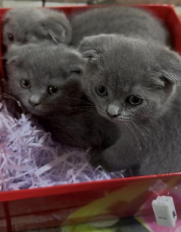 Skottiş Fold balaları – boz (blue/boz-boz) rəng palitrası Xüsusiyyətlər: - Cins: Scottish Fold - Qulaqlar: qatlanmış - Rəng: bərabər boz/blue, tük örtüyü sıx və yumşaq - Gözlər: iri və ifadəli - F...