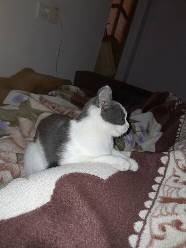 Boz-ağ rəngli ev pişiyi - Qısa tüklü, zərif və ahəngdar bədən quruluşu - Boz kürk, sinə və burun hissəsində ağ naxış, ağ pəncələr - Sarımtıl-golden gözlər, çənəaltı və bığ hissəsi ağ - Yaşıl rəngl...