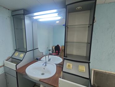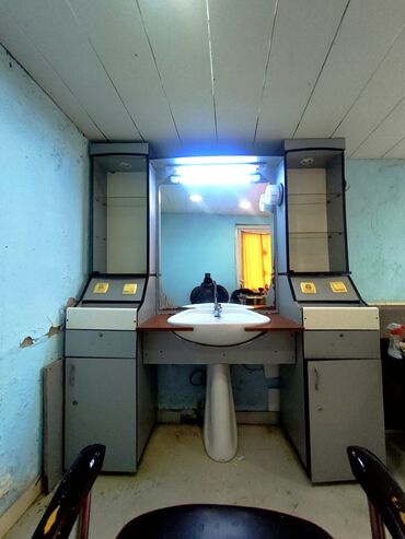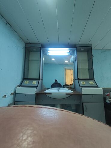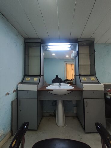 - Bərbər iş stansiyası: geniş güzgü paneli, üst LED işıqlandırma, iki yan vitrin dolabı (şüşə rəflərlə), aşağı hissədə çekmecələr və 220V rozetkalar. Güzgü önündə taxta iş səthi və quraşdırılmış keramika lavabosu (qarışdırıcı kranla).