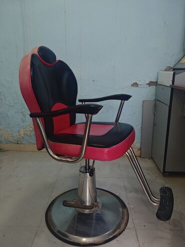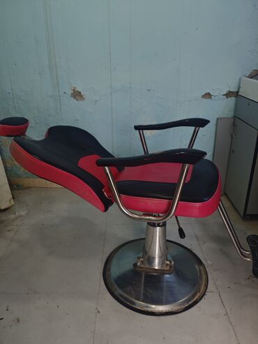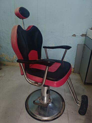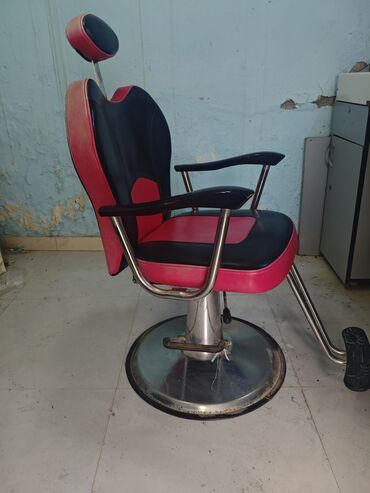 - Bərbər kreslosu: qırmızı-qara rəngdə, yumşaq oturacaq və bel dəstəyi, tənzimlənən başaltı, xrom qol dayaqları, ayaqaltı pedal. Hidravlik mexanizm sayəsində hündürlük tənzimlənir, arxaya yatırılma funksiyası var (fotoşəkillərdə göstərilib). Dairəvi metal baza sabitlik verir.