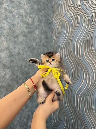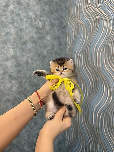 Britan (British Shorthair) balası – qızılı-şabalıd rəng çaları, iri mavi gözlər, yumşaq və sıx tük örtüyü. Boynunda sarı lentlə çəkilib.