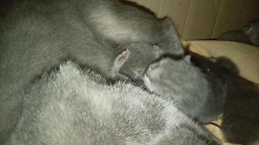 Boz rəngli, tüklü və yumşaq balaca pişik balaları - Cinsəxas xüsusiyyətlər: dairəvi baş quruluşu, qısa və sıx tük örtüyü, dolğun yanaqlar, qısa-qupqurdu quyruq, iri ifadəli gözlər. Zərif boz (blue...