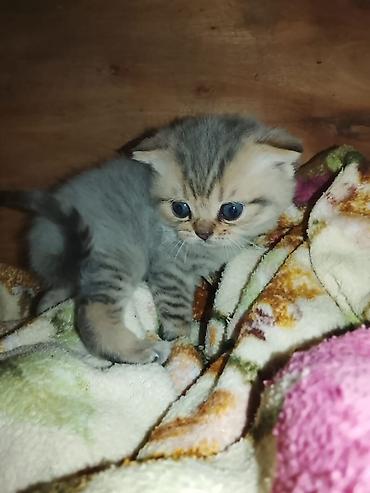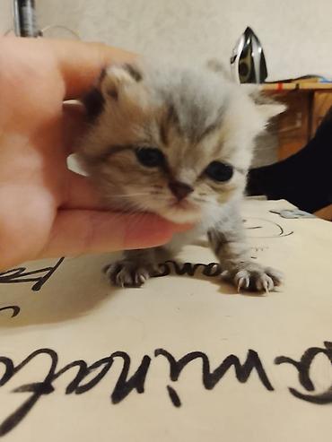 Britaniya (Scottish/ British tipli) balaca pişik balası Xüsusiyyətlər: - Rəng: gümüşü-şaded (ağ-gümüş tüklər, yumşaq zolaqlar), tünd burun və pəncə yastıqcıqları - Gözlər: iri, tünd mavi-boz - Qul...