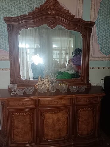 Mebel dəsti – qonaq otağı və mətbəx üçün - Oval formalı, genişləndirilə bilən yemək masası: mərkəzdə massiv taxta sütun ayaq, yumru künclər, iki parçalı üst səth. - 8 ədəd stul: taxta karkas, bel...