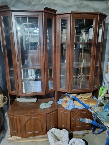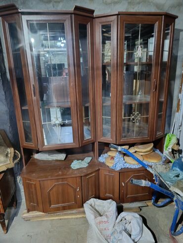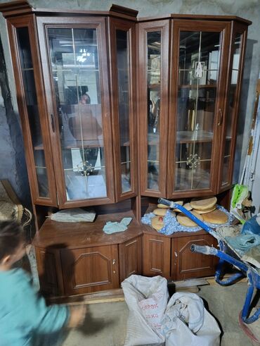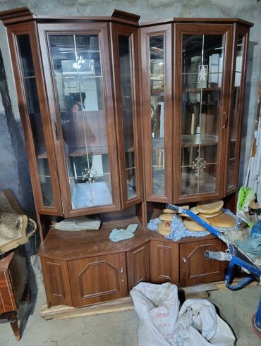 Mebel dəsti – vitrinli-divar və dolab bölmələri - Material: ağac (taxta), laklı səth - Dizayn: klassik üslub, şaquli panellər və metal halqalı tutacaqlar - Tərkib: - Şüşə qapılı iki vitrindən ib...