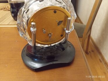 - Korpus: çoxüzlü kəsimli büllur/kristal çərçivə - Siferblat: qara fon, qızılı rəqəmlər və göstəricilər, mərkəzdə emblemlə - Mexanizm: arxadan açar ilə quraşdırılan qurma sistemi (iki açar və tənzimləmə çarxı) - Dayanacaq: qara rəngli oval baza, metal sütun dayaqlar - Ölçü təxmini: ümumi hündürlük ~18–20 sm, baza eni ~16–18 sm - Üslub: retro/vintaj stolüstü dekor və saat - Üzərində qeyd: “Made in USSR”