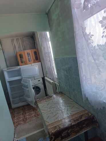 - Mətbəx: pəncərəli işıqlı məkan, pərdələr, divar kafeli; soyuducu, paltaryuyan, stol.
