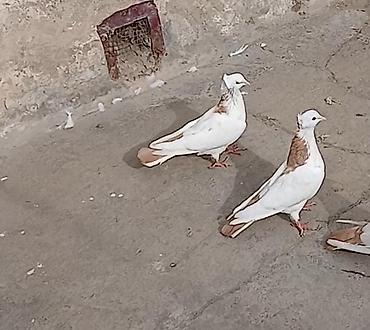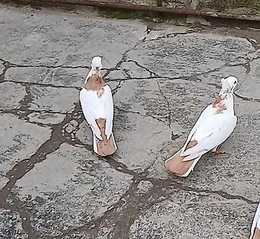 Ağ rəngli bəzəkli göyərçinlər – quyruğu yelpikvari geniş, ayaqları tüklü. Fotolarda 2 quş görünür, birinin quyruq uclarında qara naxışlar var. Uçuşu güclü, havada sabitdir (şəkillərdə uçuş kadrı va...