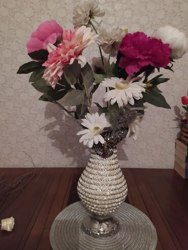 - Parlaq metalik detallı, inci və kristal effektli naxışlarla bəzədilmiş dekorativ güldan