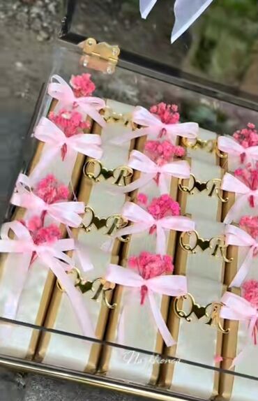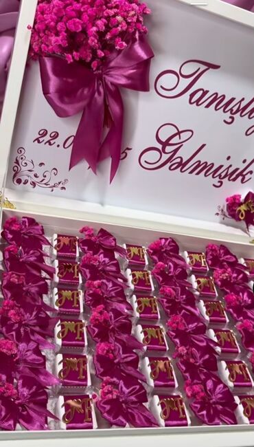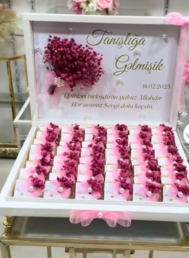 Özəl günlər, nişan mərasimləri və ad günləri üçün nəzərdə tutulmuş, içərisində kiçik şokoladlar olan ağ rəngli qutu. Qutunun qapağında "Nişanınız Mübarək" yazısı, üzük simvolları və baş hərflər yerləşir. Hər bir şokolad ayrı-ayrılıqda bəzədilmişdir. Zərif və göz oxşayan bu hədiyyə sevdikləriniz üçün unudulmaz bir sürpriz olacaq. Düzbucaqlı formada, üst hissədə qızılı rəngdə yazı və bəzək elementləri ilə tamamlanmışdır. Hər bir şokoladın üzərində qızılı rəngli kiçik çiçək bəzəkləri və ya baş hərflər vardır. Qutu nişan və toy kimi mərasimlər üçün mükəmməl seçimdir.