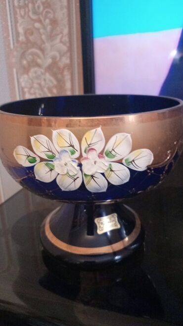 Boyalı bəzəkli şüşə meyvə qabı (ayaqlı) - Material: qalın şüşə -