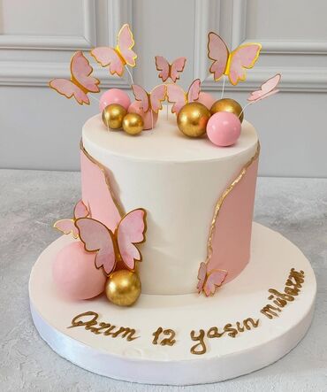 Şəkillərdə nümunələr: nişan üçün ikiqat ağ tort qızılı hərf və üzük toppəri ilə; çəhrayı taclı və kəpənəkli uşaq tortları; kəpənək dekorlu minimal dizayn.