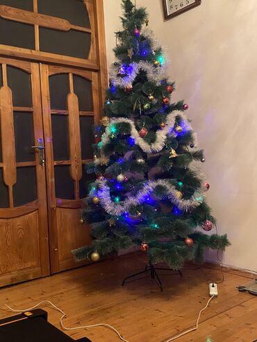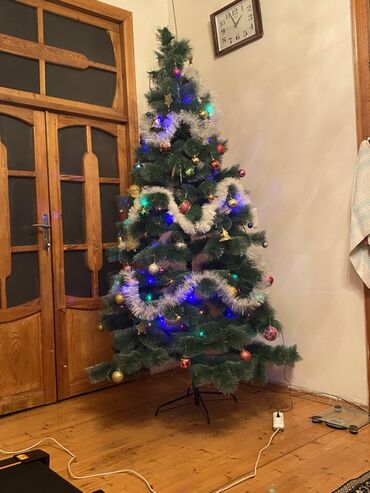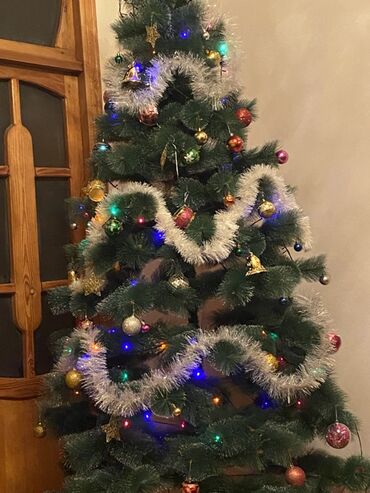 - Bəzəklər: müxtəlif ölçülü və rəngli toplar (qızılı, gümüşü, qırmızı, çəhrayı, yaşıl və s.), ulduz və zəng formalı asmalar