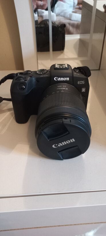 - RF montajlı standart zum obyektiv: Canon RF 24-105mm (üzərində “24-105” işarələnməsi görünür), ön qapaqla