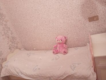 Məhsul: Tək nəfərlik çarpayı dəsti - Ölçü: standart tək nəfərlik (təxmini 90x200 sm). - Material: MDF/laminat korpus, yumşaq başlıq hissəsi (parça ilə kapitonaj və ya süngərli panel). - Rəng v...