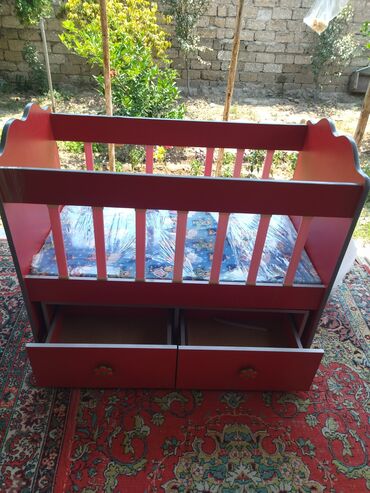 Qırmızı rəngdə, taxtadan hazırlanmış uşaq çarpayısı, əsasən yeni doğulmuş körpələr üçün nəzərdə tutulub. Yan tərəflərindəki hündür barmaqlıqlar körpənin təhlükəsizliyini təmin edir. Çarpayının altında iki geniş siyirmə var ki, bu da uşaq əşyalarını və ya yataq dəstlərini saxlamaq üçün əlverişlidir. Bu çarpayı funksionallığı və praktikliyi ilə seçilir, az yer tutaraq körpə otağında rahat bir mühit yaradır. Yataq otağınız üçün ideal bir seçimdir.