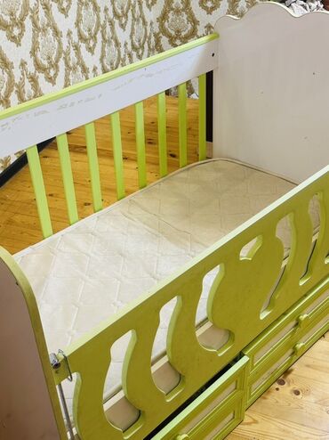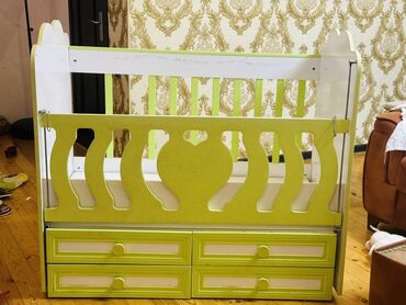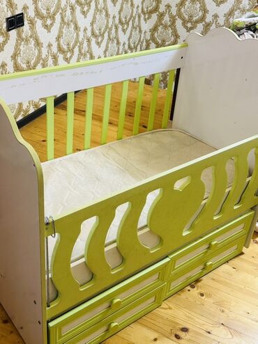 Uşaq beşiyi – ağ və açıq yaşıl rəngdə, taxta konstruksiya.