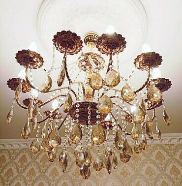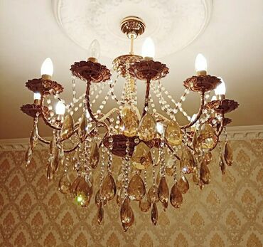 Şüşə-kristal tavan lampası (plasfon) - Forma: dairəvi, yarı-qapalı tavan tipli - Material: parlaq xrom rəngli korpus, kəsimli kristal elementlər və şüşə bəzəklər - Dizayn: ağ fon üzərində qızılı ç...