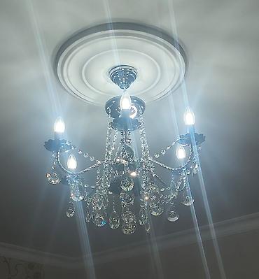 - Şüşə/kristal asqılar: müxtəlif ölçülü damcı və sfera kəsimləri, işığı çoxşaxəli sınaraq parıltı effekti yaradır.