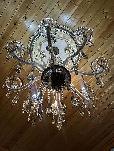 TƏCİLİ SATILIR Klassik üslubda, kristal bəzəkli tavan çilçirağı - Material: parlaq xrom rəngli metal gövdə və çoxsaylı şəffaf kristal asqılar (armud/yaş damcısı forması). - Dizayn: çoxqollu konst...