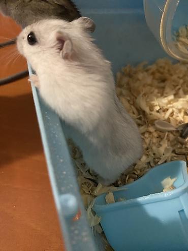 Dwarf hamster – ev heyvanı - Növ: cırtdan (dwarf) hamster - Rəng: boz-ağ qarışıq tük örtüyü, qara gözlər - Fotoşəkillərdə qəfəs və içliklə birlikdə görünür: içməli su üçün butulka, qaçış çarxı, yo...