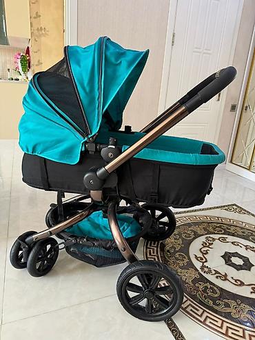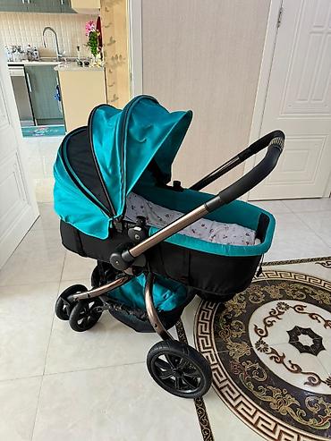 Uşaq arabası – beşik tipli, tünd firuzəyi (turkuaz) və qara rəng kombinasiyasında.