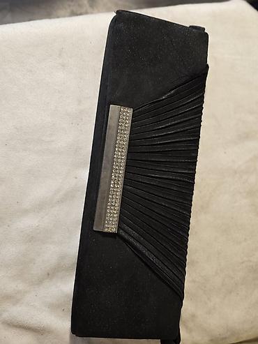 - Qara süet effekti olan clutch: yelpikvari plisə işləmə, ön hissədə qaşlı metal zolaq, sərt forma, qapaqlı. Minimalist və zərif stil.