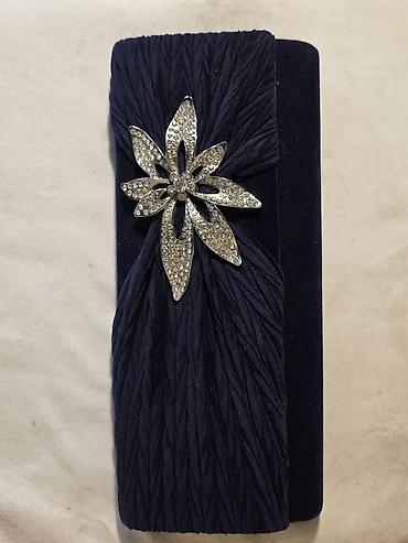 - Tünd göy teksturlu clutch: qırış effektli parça üzərində iri qaşlı gümüşü çiçək bəzəyi, sərt korpus, üst qapaqlı. Axşam geyimləri ilə uyğun elegant görünüş.