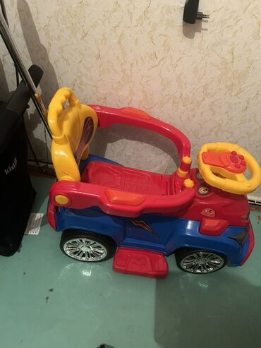 - Uşaq ayaqla itələnən maşın: parlaq qırmızı-mavi-göy rənglər, xrom effektli iri təkərlər, arxa itələmə tutacağı, təhlükəsizlik üçün yan qoruyucular, ayaq qoymaq üçün platforma, düyməli kiçik sükan paneli.