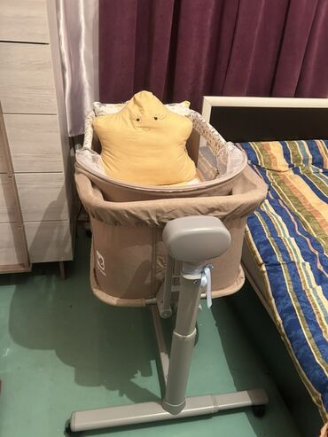 - Cool Baby beşik (yanı açılan besik tipi): tək dayaqlı, hündürlüyü tənzimlənən metal konstruksiya, sabit baza və təkərli ayaqlar. Nəfəsalan mesh yan panellər, çıxarıla bilən parça bortlar və ağ torlu cib. Yataq hissəsi yumşaq kənarlı, uşaqla eyni səviyyədə valideyn çarpayısına yaxınlaşdırmaq üçün uyğundur. Daxildə ulduz naxışlı kənar və baldaxan toru görünür. Beşiyin üzərində “Cool Baby” loqosu.