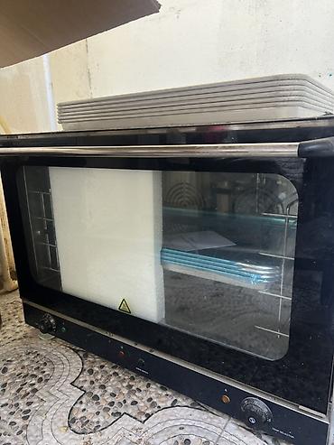 - Konveksiya tipli elektrik peçi: Böyük həcmli şüşə qapı, içəridə çoxsəviyyəli rəflər, temperatur seçici və taymer düymələri. Ön paneldə işıq indikatorları, paslanmayan korpus və istiliyədavamlı tutacaq. Üstündə metal tepsilər dəsti.