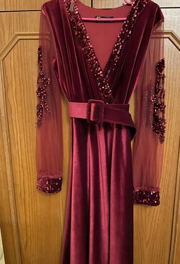 Qadin ziyafet paltari (qirmizi reng). X-lady- den 250m alinib. Seliqeli istifade olunub. 2 defe geyinilib. Olcu - 40