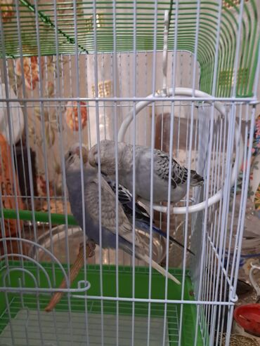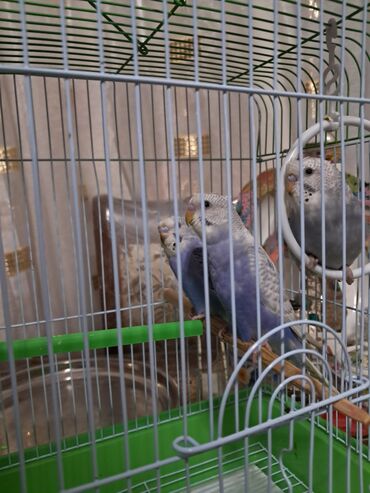 Məhsul: Dalmaçalı və mavi tonlarda dalğıc/xanım cinsləri olan dalğalı tutuquşular (bildçik/paraket) cütlükləri, qəfəs və aksesuarlarla.