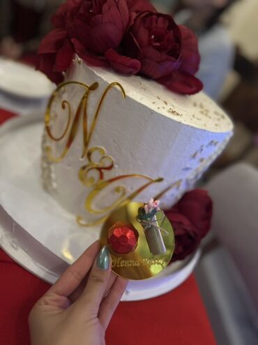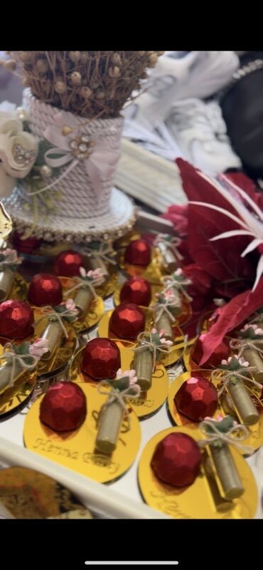 Xına gecəsi üçün bəzəkli dəst - Qırmızı məxmər əsaslı, dairəvi təqdimat altlığı; ön hissədə “Henna Party” yazısı qızılı rəngdə. - Ətrafı qırmızı lələk və atlas lentlərlə zəngin dekorlu. - Üst hiss...
