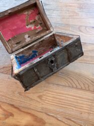 - Üst qapaq: relyefli panellər və mərkəzdə metal ürək formalı bəzək; üst hissədə əlavə möhkəmləndirmə zolaqları