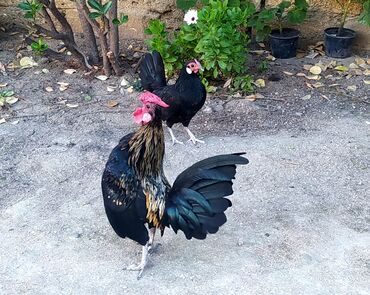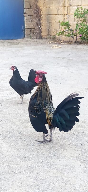 Məhsul: Yerli toyuq-quş dəsti Təsvir: - Şəkillərdə uzunboylu, əzələli gövdəli bir xoruz və yanında bir toyuq görünür. Xoruz çoxrəngli lələklərə malikdir: qara əsas fon üzərində ağ, krem və pas ton...