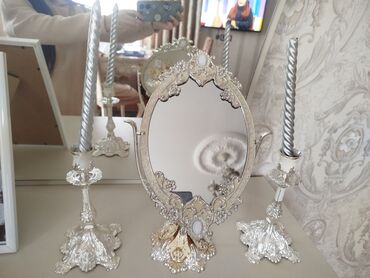 - 1 ədəd oval stolüstü güzgü – bəzəkli barokko motivli çərçivə, incə oyma detallar, ağ daş effektli medalyonlar, gümüşü tonlarda, alt hissədə qızılı vurğular. Güzgünün hər iki tərəfində tutacaq vurğuları var, dayanıqlı dekorativ ayaq üzərində durur.