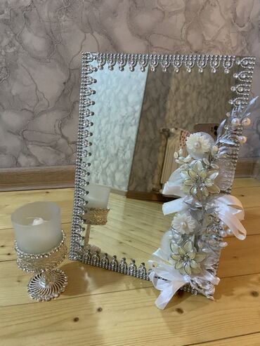 - Güzgü: Düzbucaqlı forma, kənarları tam boyu gümüş tonlu muncuq və kristal naxışlarla işlənib. Sağ kənarda ağ və krem çalarda çiçək kompozisiyası, incili detalları və atlas lent bəzəkləri ilə vurğulanıb.