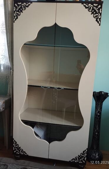 Şüşəli vitrin şkafı iki qapılı dizayna malikdir, ağ rəngdə və üst hissəsində qara, naxışlı dekorativ elementlərlə tamamlanmışdır. Şkafın orta hissəsi şüşə qapılarla təchiz olunub, içərisində saxlama üçün şüşə rəflər mövcuddur. Aşağı və yuxarı kənarlarında qara rəngdə, naxışlı detallar şkafın ümumi görünüşünə zəriflik qatır. Bu şkaf qab-qacaq, suvenirlər və ya digər dekorativ əşyaları sərgiləmək üçün uyğundur.