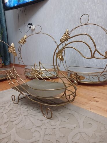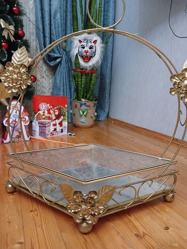 - Material: qızılı rəngli metal karkas, şəffaf qalın şüşə qab (oval, yarımdairə və kvadrat formalı bölmələr).
