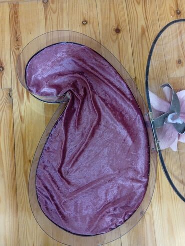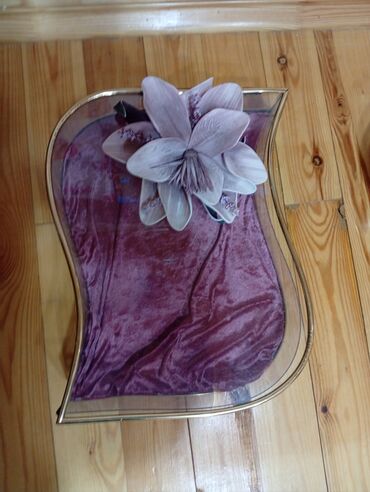 - Şəkil 1-2: Buta formalı, şəffaf akril/şüşə gövdə, qızılı kənar haşiyə, qapaqlı konstruksiya. İç hissə bənövşəyi məxmər/parça ilə örtülüb. Üzərində dekorativ süni çiçək kompozisiyası. Zərgərlik, aksesuar, xatirə əşyaları, nişan/qızıl təqdimatı üçün uyğundur.