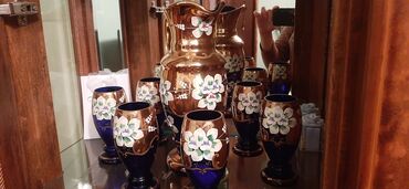 Şüşə qrafin və qədəh dəsti - 1 ədəd qrafin: uzun boğazlı, şüşə tıxaclı. Narıncı-çəhrayı tonlarda, üzərində əl işinə bənzər ağ çiçəklər və yaşıl yarpaqlarla bəzək. - 6 ədəd ayaqlı qədəh: qızılı-alt...100 AZN