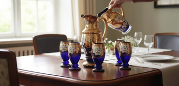 Qızılı-çəhrayı və kobalt-mavi tonlarda dekorativ sürahi və 6 stəkandan ibarət dəst. - Material: şüşə/bohem tipli qalın şüşə. - Rəng: parlaq qızılı örtük, iç hissəsi və alt hissələri kobalt-mavi. -...