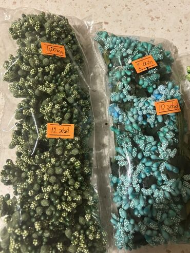 - Paketlənmiş halda dəstlər; hər dəstdə çoxsaylı kiçik çiçək başlıqları və yaşıl yarpaqlar var