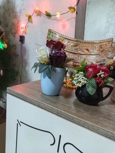 - Kiçik kompozisiyalar: fincan və balaca qabda süni güllər və yarpaqlardan ibarət dekorlar. Kompakt ölçülü olduqları üçün iş masası, komod, rəf və ya konsol üçün əlverişlidir.