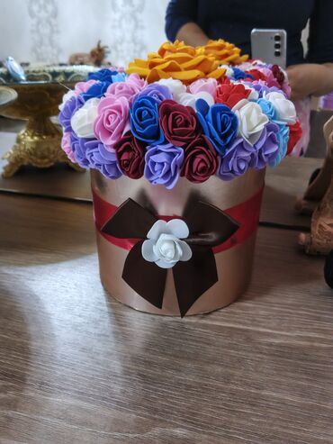 - Zərif hədiyyə qutusunda müxtəlif rəngli güllərdən ibarət bəzək: sarı, qırmızı, mavi, bənövşəyi, çəhrayı və ağ tonların harmoniyası. Qutunun üzərində atlas lent və dekorativ ağ gül aksesuarı var. Masaüstü, vitrin və ya giriş üçün diqqətçəkən mərkəz bəzəyi kimi uyğundur.