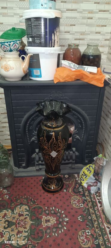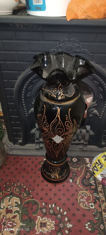 Şık dekorativ vaza - Material: şüşə/keramika əsaslı parlaq qara korpus - Dizayn: qızılı rəngli naxışlı bitki motivləri, ön hissədə çiçək formasında bəzək daşı (daşlarla işlənmiş kompozisiya) - For...