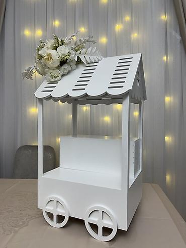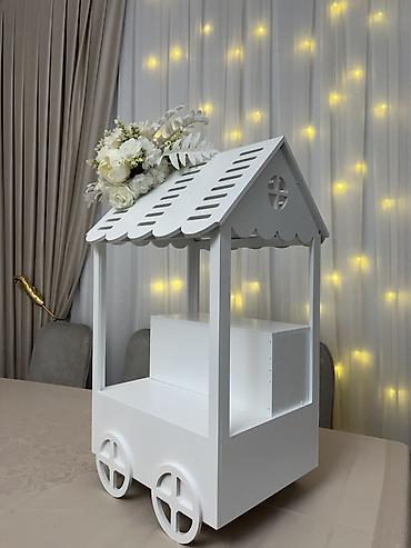 - Dizayn: üstü damlı, dalğalı saçaklı, yanları açıq vitrin; dörd dekorativ təkər; damda bəzək üçün süni ağ çiçək kompozisiyası